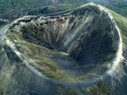 El cráter es una enorme boca de 850 m de eje mayor por 750 de eje menor aproximadamente, con profundidad de 175 a 400 m en la parte más alta.